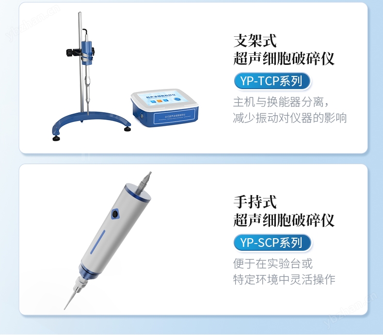 利用超聲波在液體中的分散效應,使液體產生空化的作用,從而使液體中的固體顆粒或細胞組織破碎.超聲波細胞粉碎機由超聲波發生器和換能器二大部分組成。超聲波發生器將市電轉變成20-25KHz交變電能供給換能器。鋯鈦酸鋇壓電振子是換能器的心臟,它隨交變電壓以20-25KHz頻率作伸縮彈性形變,換能器隨之作縱向機械振動。振動波通過浸入在生物溶液中的鈦合金變幅桿產生空化效應,激發介質里的生物微粒劇烈振動。