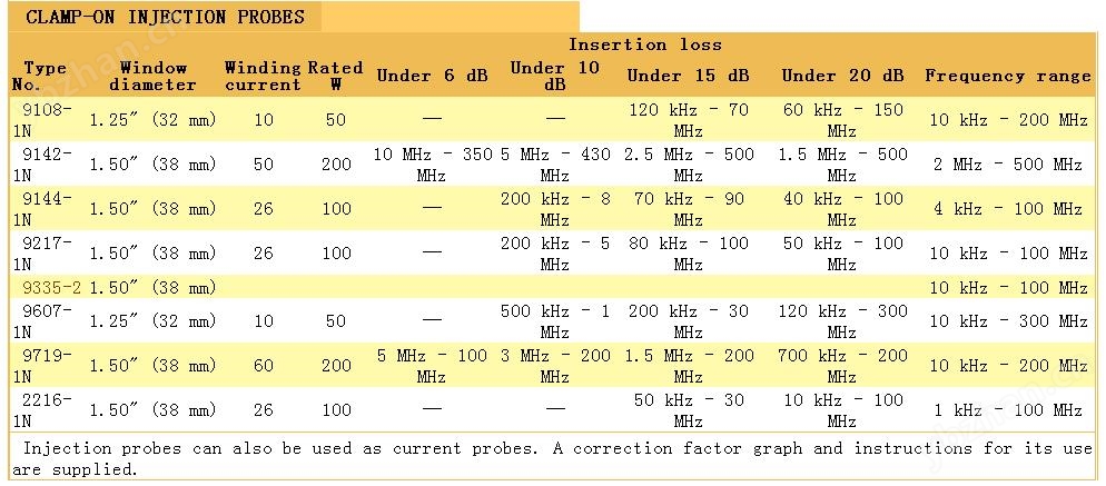 注入探頭也可用作電流探頭。提供了校正系數圖及其使用說明。