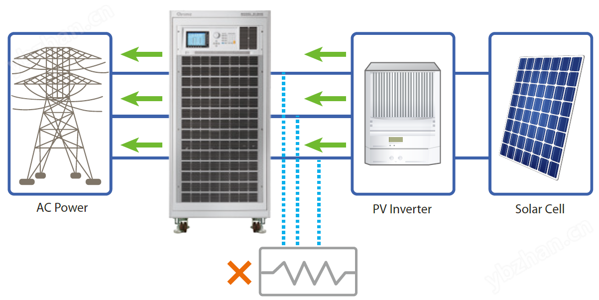 61800系列的能源回收功能提供了一個有效的節省能源的解決方案,例如:在測試太陽能逆變器所產生的能量可以經由61800回饋到電網,因此不需要另外搭配消耗功率電阻。(見下圖)