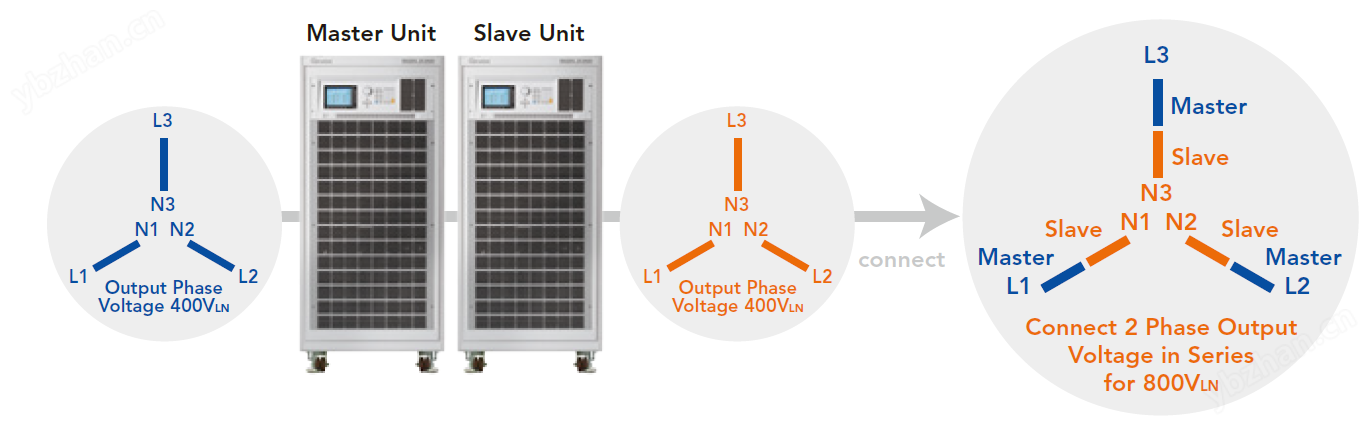 B618002 120kVA 800VLN XHV選購配件以兩臺61860串聯連接達到800VLN 相電壓(1385VLL )輸出實現。相較于一般使用升壓變壓器達到高電壓方式, B618002 XHV選購配件可以提供更佳的輸出電壓暫態性能及特性,以符合應用于高壓光伏逆變器(HV PV Inverter)測試需求(線電壓高達1000VLL )。