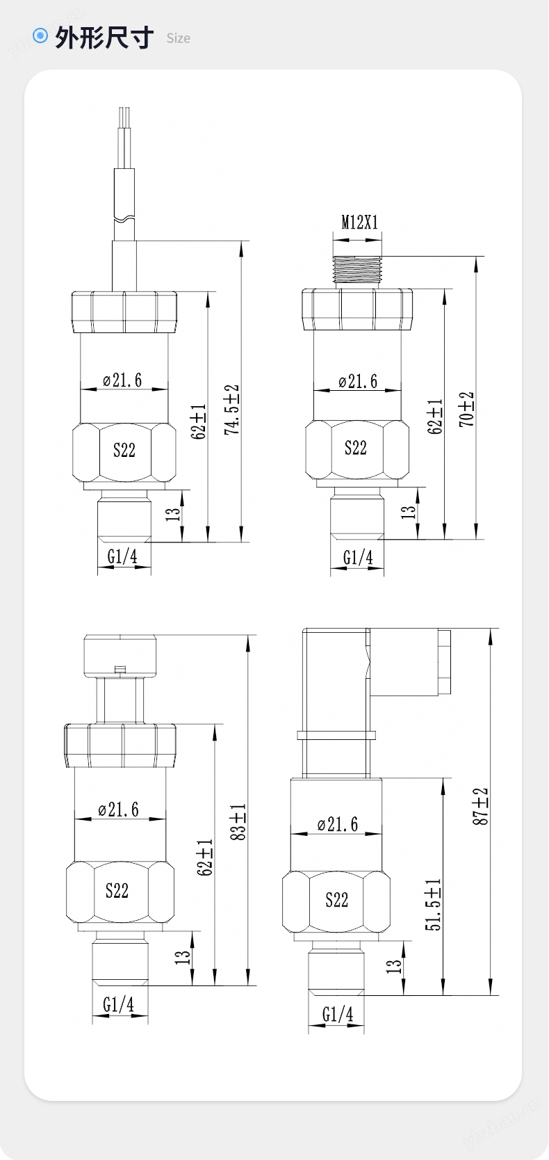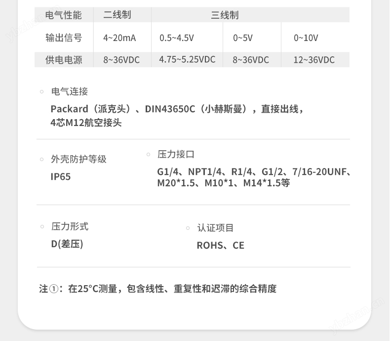 精度① | 0.5%F.S(量程>0.3MPa)、1.0%F.S | 穩定度 | <0.5%F.S/年 |