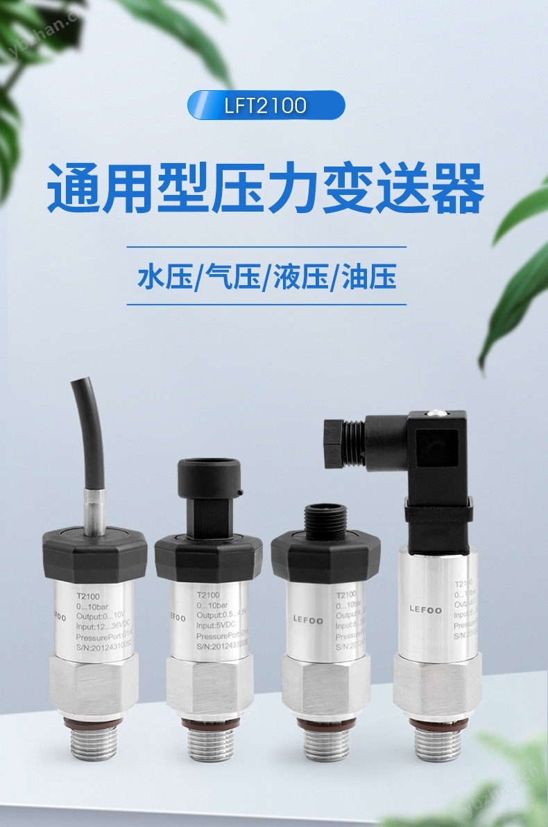 LFT2100通用型壓力變送器廣泛應用于消防、水處理、供水系統、空氣壓縮機、氣動裝置、工廠自動化等測試系統中流體介質壓力的測量。獨特的防水透氣結構,防止內部與外部氣壓不一致而產生精度偏移。高過載能力的陶瓷敏感膜片,擁有抗腐蝕、抗磨損性能。采用ASIC技術、MEMS技術、數字補償技術,精度高、溫漂小。該產品還具有體積小、防護等級較高、抗干擾能力較強的特點,可應用于各種復雜環境。