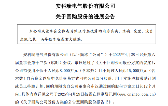 安科瑞于2025年4月28日召開第六屆董事會第十三次(臨時)會議,審議通過了《關于回購公司股份方案的議案》,公司擬使用不低于人民幣8,000萬元(含本數)且不超過人民幣15,000萬元(含本數)自有資金以集中競價交易方式回購公司部分股份,用于實施股權激勵計劃或員工持股計劃,回購期限為自公司董事會審議通過回購股份方案之日起12個月內。